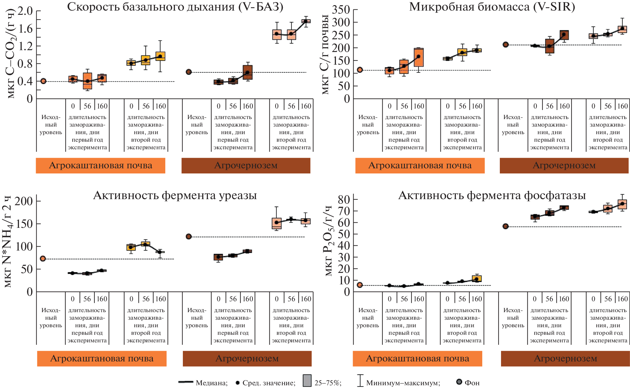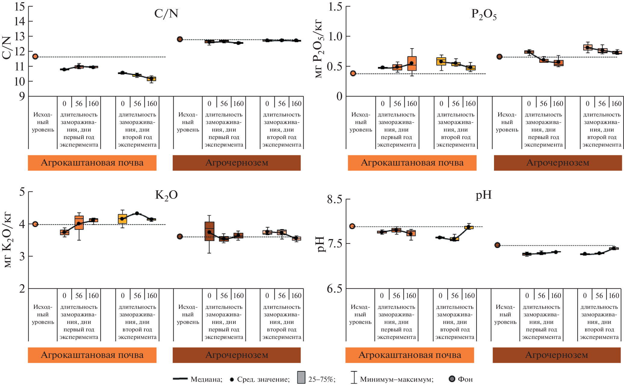 The results of a 2-year vegetation experiment to study the effect of the duration of the frost-free period on the chemical properties and biological activity of agrokashtan soils and agrochernozem are presented. The task of the experiment was to assess changes in soil properties that may occur with further warming of the climate and a reduction in the time of stay of soils in the frozen state. The first variant of the experiment provided for incubation of soils in a frozen state in winter for 160 days, the second – 56 days, in the third variant, the soil was incubated throughout the winter period at a temperature of >0°C. Before winter incubation, the soil was moistened to 60% of FMC, mineral fertilizers and straw were applied. In the spring, spring wheat of the Zlata variety of the selection of the Moscow NIISH “Nemchinovka” was sown in the soil. Throughout the growing season, soil samples were kept in the vegetation pavilion in conditions of natural moisture and illumination. Sampling and measurements of biological properties were carried out in the spring period 10 days after the samples were transferred from the refrigerator to the vegetation pavilion. It was found that, depending on the duration of the freezing period of the studied soils, the most sensitive indicators for temperature changes were microbial biomass (C-LED), basal respiration rate (V-BASRR) of the microbial community and the number of microorganisms (NMO) growing on soil agar and on a rich medium. The soils that were incubated without freezing had the lowest values of C-LED and V-BASRR. The increase in the freezing period of the soil affected the acidity of the soils. In the variants with prolonged freezing in the 2nd year of the study, the pH value increased. For agrochernozem, a decrease in the content of P2O5 was noted as the freezing period increased. For agrokashtan soils, this pattern was less pronounced. In these soils, a tendency to decrease the C : N ratio was revealed with an increase in the time spent in the frozen state. The content of Corg, as well as macro- and microelements in all variants practically did not change during the 2 years of the experiment.