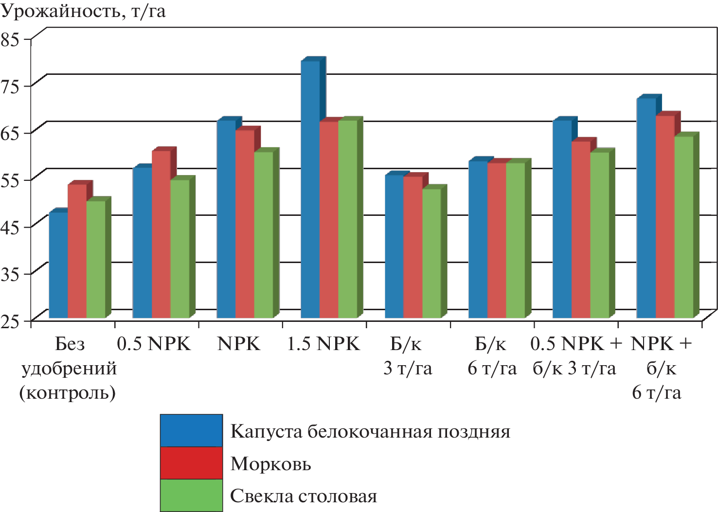 In a laboratory and field experiment conducted in the climatic conditions of the Moscow region, it was found that after 2 rotations (6 years) saturated vegetable crop rotation (late white cabbage – carrots – table beets) on alluvial meadow medium loamy soil with annual application of biocompost at a dose of 6 t/ha (total of 18 t/ha), the humus content in the soil stabilized, a tendency to accumulation of alkaline hydrolyzable nitrogen fraction (+6%) was noted and the consumption of mobile forms of phosphorus (–4%) and potassium (–6%), as well as soil decompression. The use of mineral fertilizers in single and one-and-a-half doses revealed a tendency to decrease the content of humus in the soil (by 3–4%), hydrolyzable nitrogen (by 7–8%) and the accumulation of mobile phosphorus (by 1–15%) and potassium (by 3–22%). The introduction of a low dose of mineral fertilizers led to a deterioration of soil fertility, a decrease in the content of humus (–5%), mobile phosphorus and potassium (by 5 and 17%). Slightly more effective was the introduction of biocompost annually at a dose of 3 t/ha. With the joint application of biocompost (6 t/ha) and a single dose of NPK, stabilization of the humus content in the soil at the initial level, accumulation of hydrolyzable nitrogen (by 9%), mobile phosphorus and potassium (by 5–6%) was noted. During 2 rotations, there was a decrease in the content of exchangeable calcium (by 1–10% from the initial level) and magnesium (by 3–11%) and weak acidification of the soil (a decrease in pHKCl by 1–2% from the initial indicator). It was found that the average productivity of arable land without the use of fertilizers was 50 t/ha, increased by 14 when the half dose was applied, by 28 when the single dose was applied, and by 42% when the half dose was applied, the use of biocompost at doses of 3 and 6 t/ha provided an increase in productivity by 8–16%. With the joint annual application of biocompost with a single dose of NPK, the average productivity of crop rotation increased by 26–35%.