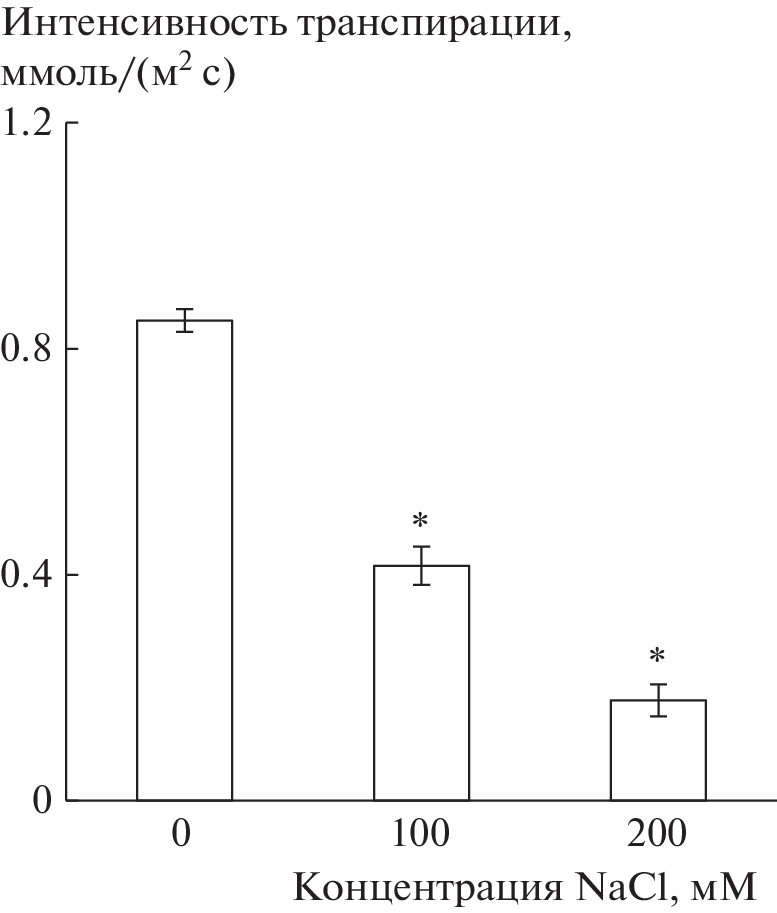 The influence of moderate and strong chloride salinity on seedlings of barley (Hordeum vulgare L.) Nur variety was studied under controlled environment conditions. Exposure of seedlings to both moderate (100 mM) and high concentrations (200 mM) of NaCl for 7 days led to a slowdown in the growth of their roots and shoots. At the same time, in the variant using NaCl in moderate concentration, an increase in the content of pigments was noted in the leaves of seedlings (chlorophylls and carotenoids by 25 and 22%, respectively). Also the photosynthesis rate decreased by 25% (relative to the control). In contrast, under the influence of a high concentration of NaCl, the content of pigments, as well as stomatal conductance, decreased markedly, which was accompanied by an almost twofold slowdown in the rate of photosynthesis. At the same time, transpiration was inhibited and tissue hydration decreased. It was concluded that the resistance of barley to NaCl can be judged already in the early phases of plant development. It is also noted that the most sensitive to the presence of NaCl in the root environment are easily recorded morpho-physiological indicators – the linear size of the shoot and its raw biomass.