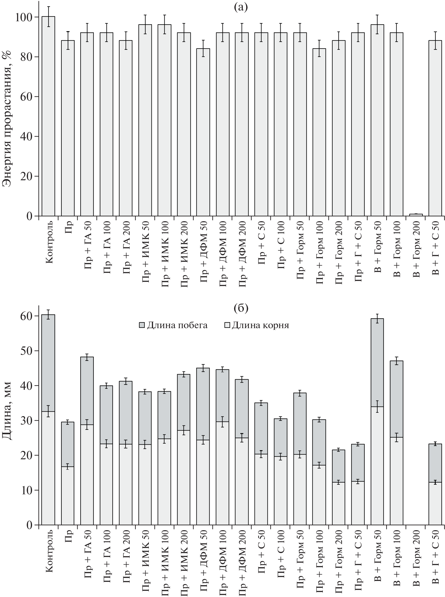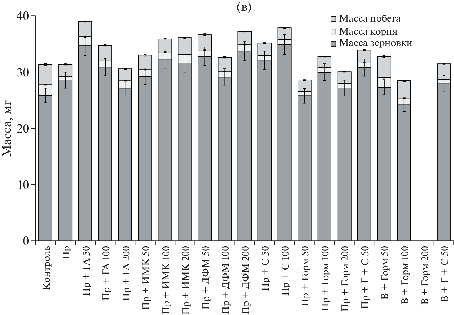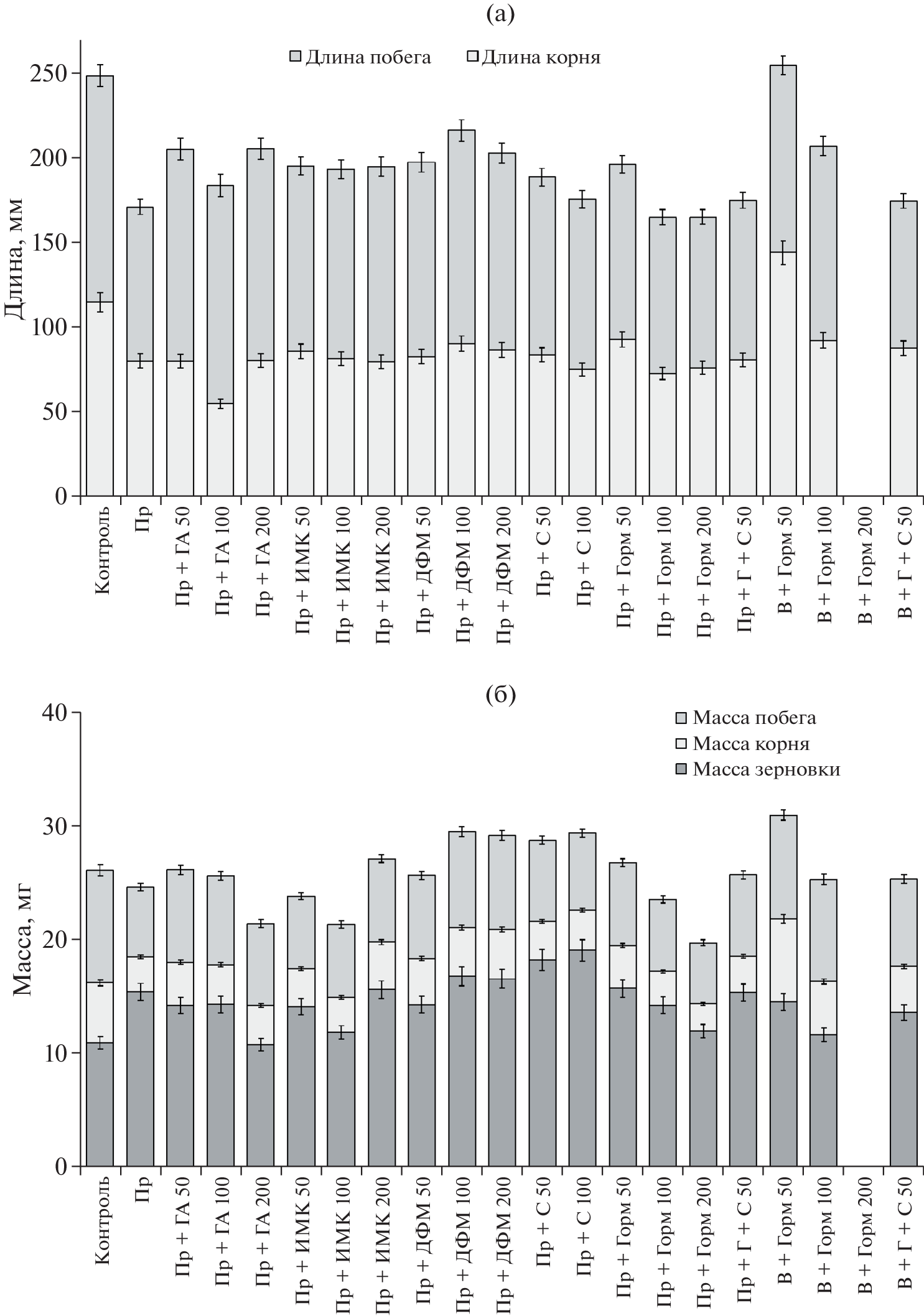 One of the reasons for the decrease in the yield of crops is the retardant effect of fungicides. In addition, many fungicides have a toxigenic effect on the mycelium of the fungus. The combination of a fungicide and a plant growth stimulant in a complex preparation can help to reduce the level of the negative effect of the pesticide. It is proposed to introduce individual growth regulators and their combination into the composition of the seed protectant in doses of 50, 100, 200 g/l. The length and the weight of the root and shoot of seedlings under the influence of the seed protectant were less than in the control, and the weight of the endosperm of grain was greater. Under the influence of the seed protectant and gibberellic acid, the length of the shoots corresponded to the control, but their weight was decreased. Indolylbutyric acid, added to the seed protectant, contributed to the effective consumption of spare substances of the endosperm of grain and root growth. Under the influence of the protectant and diphenylurea, the length and the weight of the shoot increased significantly in a balanced manner. The composition of the protectant and the named growth regulators in minimal doses affected the growth of the roots and shoots in the best way of all variants. Preference should be given to low doses of phytohormones and their combination.