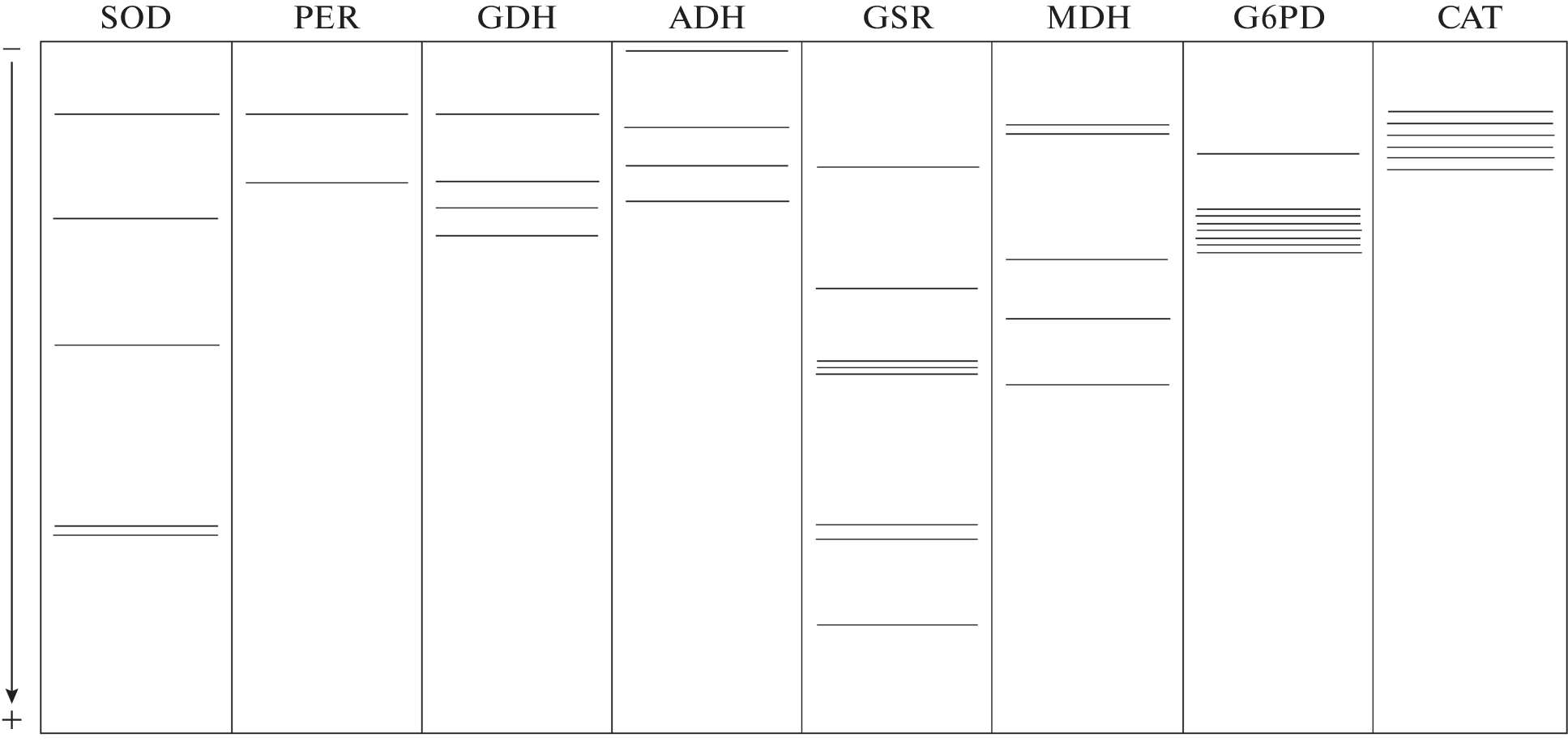In was the laboratory experiment carried on with the spring barley variants, which shown a contrasting reactions to the cadmium influence. The topic of this work was a searching of the connection of the barley variants response to the toxic stress with the isoenzyme polymorphism of some ferments, which are determined a plants tolerance to the environmental stress. It was taken 14 spring barley variants with the different geographic origin (7 – tolerant to Cd2+ and 7 – sensitive) for this task. Such variants were selected on the base of the morphometric criteria in our previous work. The seeds of these variants were germinated and then a protein extracts were prepared from the seedlings. The extracts were separated by electrophoresis in the polyacrilamide gel. The gel blocks after this process were stained for discovering of the enzyme activity zones. The list of the ferments used was follows: superoxidedismutase, peroxidase, glutamatedehydrohenase, alcoholdehydrohenase, malatedehydrohenase, glutationedehydrohenase, glucose-6-phosphatedehydrohenase, catalase. The frequencies of all enzyme activity zones were counted, and thus such frequencies were compared for the groups of the Cd2+ tolerant and sensitive barley variants. Consequently, it was discovered the specific alleles, which are found in the tolerant or sensitive variants with the much probability. Therefore, some conclusion can be stated: the reaction of the selected barley variant to the Cd2+ influence is connected with some specific isozyme variants. The data, collected in this work, can be used for forecasting of the tolerance of the selected barley variants to the Cd2+.