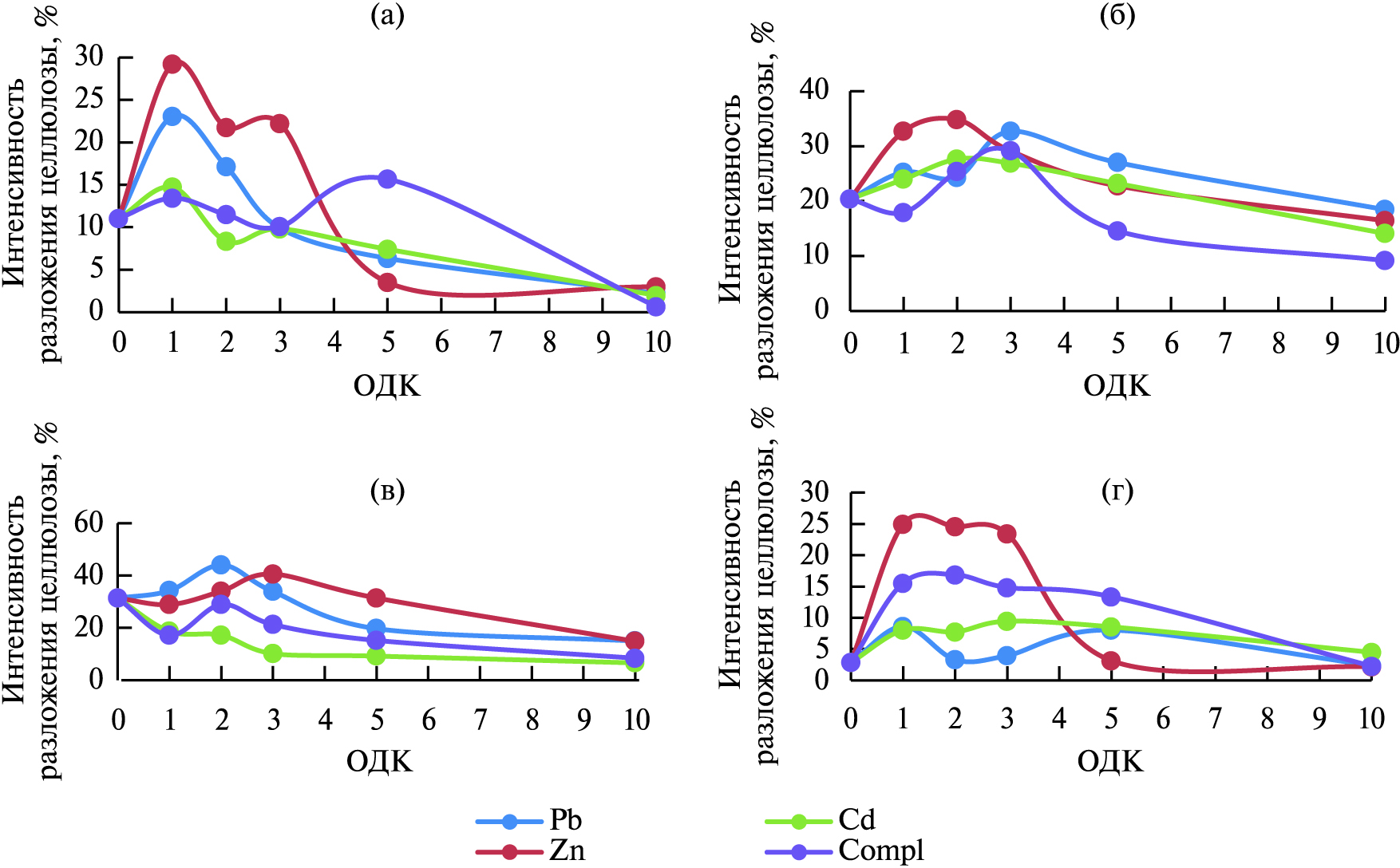 Рис. 2. Интенсивность разрушения целлюлозы при различном содержании тяжелых металлов в дерново-подзолистой почве (а) серой лесной (б), черноземе выщелоченном (в) и каштановой (г) почвах.