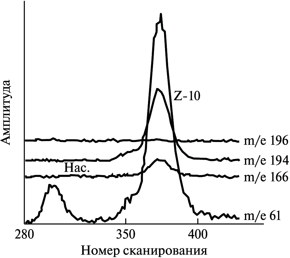 Впервые масс-фрагментография была удачно использована при идентификации не разделившихся ГЖХ-пиков составных частей феромона листовертки A. semiferanus. Из предварительных исследований феромона самок микроаналитическими методами было сделано заключение о наличии в феромоне С14-ацетатов [10]. Испытание серии тетрадеценилацетатов указало на то, что одним из компонентов может быть Z-10-TDA. Однако некоторые другие тетрадеценилацетаты тоже были привлекательны для самок. Для проведения масс-фрагментографии активной фракции было запрограммировано сканирование только тех ионов, которые были характерны для насыщенных и мононенасыщенных ацетатов с С14 атомами углерода: m/e 196 (M-60), 194 (M-60), 166 (194–28), 61 (CH3COOH2)+. На рис. 1 Z-5-TDA является одним из компонентов сложной смеси тетрадеценил-ацетатов.