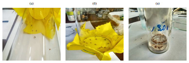 Рис. 2. Последовательность действий при исследовании дынной мухи: (а) – цилиндрическая конструкция для проведения процесса морилки, (б) – препарирование насекомых, (в) – приготовленный экстракт