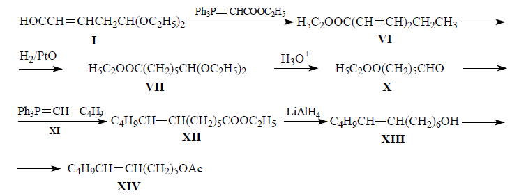 Цис-7-додеценилацетат является компонентом феромона совки гамма (Autographa gamma). Синтез его синтетического аналога основывается на взаимодействии карбэтоксиметилентрифинилфосфарана (V) с монодиэтилацеталь-пимелиновым альдегидом (I) и проходит с образованием диенового эфироацеталя (VI) с хорошим выходом. Гидрирование (VI) над окисью платины дает продукт – эфироацеталь (IV). Кислый гидролиз этого ацеталя в мягких условиях приводит с высоким выходом к этиловому эфиру 7-оксогептановой кислоты. Затем проводят конденсацию альдегида (VII) с пентилидентрифенил фосфораном (VIII) в условиях “цис-олифинирования” (VIII). Последний продукт восстанавливают алюмогидридом лития в соответствующий 7-цис-додецен-1-ол (XVI), который окисляют с помощью хлорхроматомпиридина в цис-7-додеценаль и ацелируют до продукта (XIV):