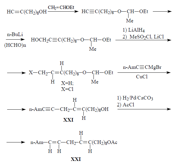 Реакцией моноацеталя (IV) с фосфораном, генерированным из фосфонийной соли (ХХ) в условиях цис-олефинирования с выходом 84%, получен диэтилацеталь цис-5-ундецаналя (XXIII), кислотный гидролиз которого приводил с выходом 77% к цис-5-ундеценалю (XXV). Альдегид (XXIV) с магнийбромдецилом с умеренным выходом давал непредельный спирт (XVIII), окисленный хлорхроматомпиридином в конечный кетон (XXV). Общий выход кетона, исходя из моноацеталя, составлял 28.7%: