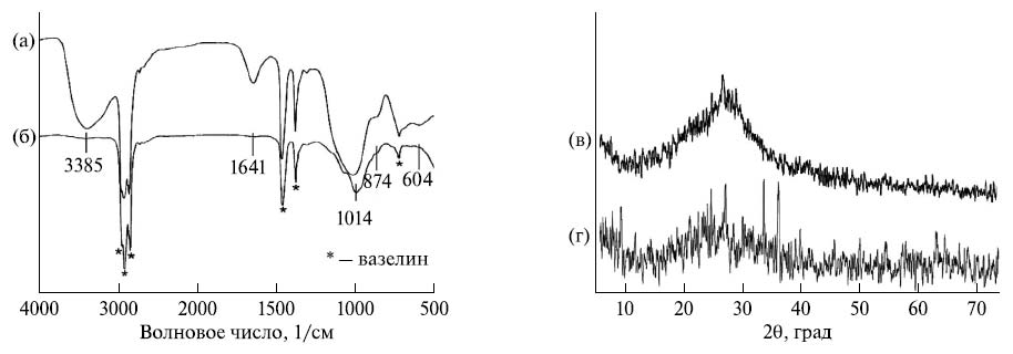 Рис. 2. ИК-спектры и рентгенограммы образцов: а, в – из растительного сырья, б, г – из минерального