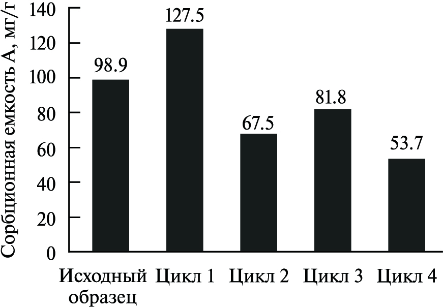 Рис. 5. Сорбционная емкость биогенного алюмосиликата натрия (образец 8) после 4-х циклов регенерации