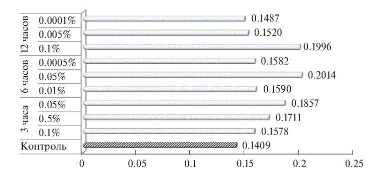 В лабораторном опыте оценили массу проростков семян табака, обработанных биостимулятором Grow–B. Лучшие результаты получены при использовании концентрации 0.05% и времени замачивания семян в течение 6 ч, в этом случае масса проростков была наибольшей – 0.201 г. (НСР05 = 0.0105), т. е. по сравнению с контрольным вариантом увеличилась на 43% (рис. 1).