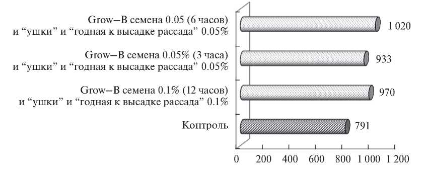 Обработки биостимулятором Grow–B при использовании выбранных схем применения значительно в сравнении с контролем на 18–29% увеличивали выход стандартной рассады – основного экономического показателя парникового опыта (НСР05 = 54) (рис. 2).