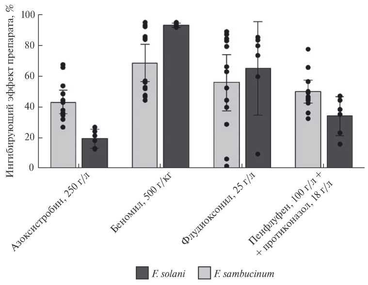 В среднем для всех препаратов влияние фунгицидов на рост штаммов видов Fusarium не имело достоверных различий. Ингибирующее действие на F. sambucinum варьировало в диапазоне 1‒95% и в среднем составило 53 ± 3%. Ингибирующее действие препаратов на рост штаммов F. solani варьировало от 9 до 95% и в среднем составило 53 ± 7%.