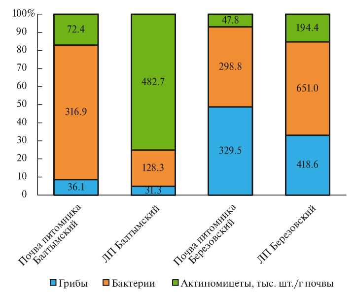 Последнее, вероятно, указывало на слабую окультуренность пахотного слоя почвы лесных питомников, поскольку показано, что в верхнем слое дерново-подзолистой почвы в лесных насаждениях содержится меньше микроорганизмов, чем в ее окультуренном варианте [21]. Лесной субстрат, полученный из Березовского р-на, отличался более высоким содержанием микробных клеток, чем из Балтымского. Изучение соотношения между таксономическими группами микроорганизмов показало, что почва и лесной субстрат из Балтымского р-на резко различались между собой – в лесном образце преобладали актиномицеты, и только небольшая часть приходилась на грибы и бактерии. В образце из питомника, отобранном перед началом эксперимента, преобладала бактериальная составляющая. Соотношение групп микроорганизмов в подстилке и почве питомника из Березовского р-на было похожим – преобладали грибы (в почве питомника их было на 10% больше, чем в лесном субстрате) и бактерии, и только небольшую часть составляли актиномицеты.