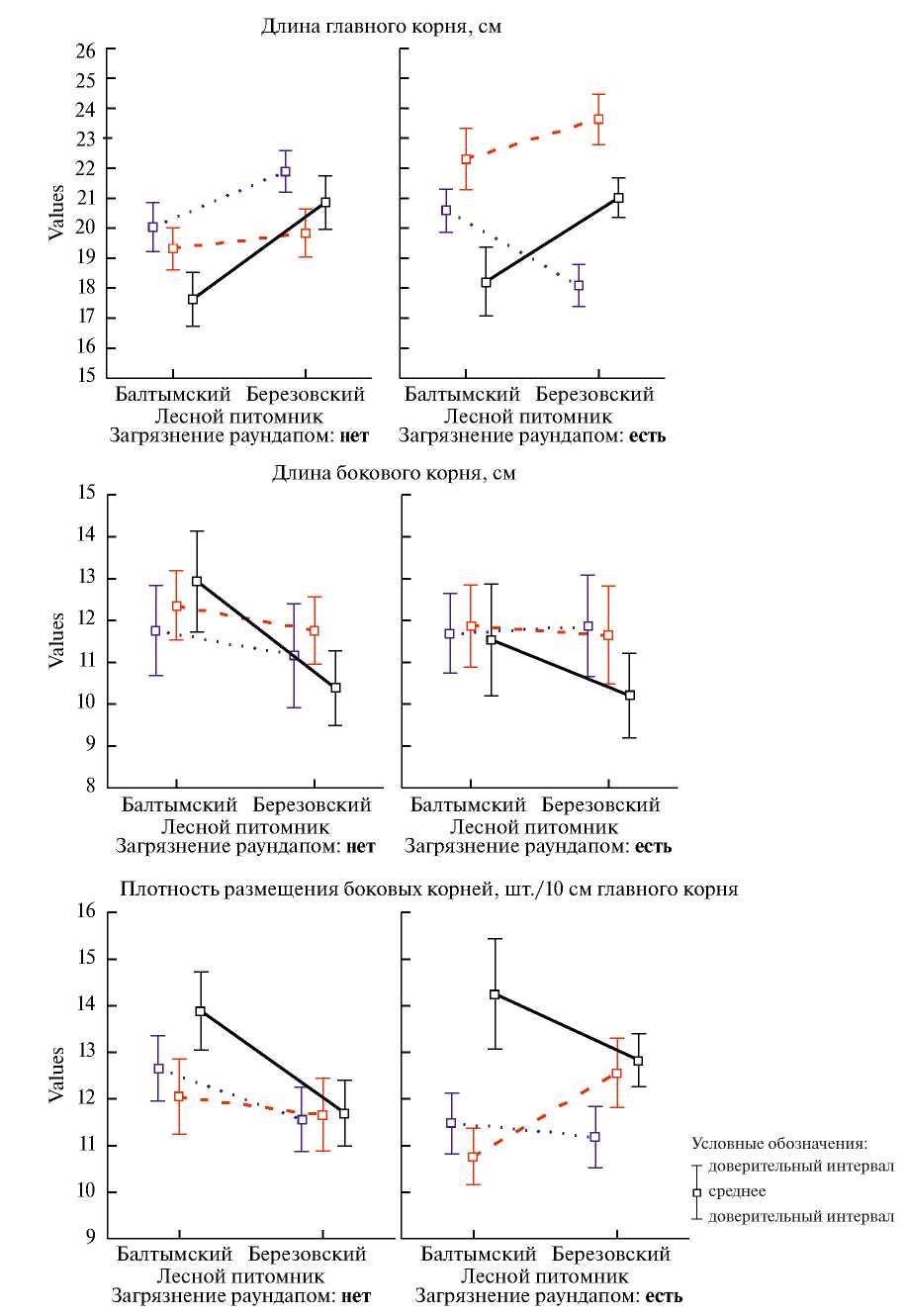 Статистическую оценку влияния внесенного в пахотную почву мелиоранта на параметры корневой системы сеянцев проводили методом дисперсионного анализа. Рассматривали влияние фактора “вариант” (контроль или внесение лесной подстилки). Группирующими переменными были “лесной питомник” (Березовский, Балтымский), “загрязнение раундапом” (есть, нет). Характеристики, описывающие развитие подземной части сеянцев, представлены на рис. 3 и 4 в виде средних показателей и их доверительных интервалов. Такое графическое изображение позволяет судить о достоверности различий средних с уверенностью в 95% случаев, если границы интервалов не перекрываются.