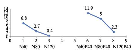 При анализе содержания нитратного азота в 3-метровом слое почвы в 2015 г. обнаружено, что при одной и той же дозе внесения N40 потери от вымывания нитратов существенно снижались, если азот вносили в сочетании с фосфором (рис. 2).