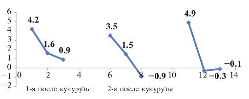 Такая закономерность отмечена в опыте еще в годы севооборота. Поскольку почва бедна подвижным фосфором (40 мг/кг), одно азотное удобрение слабо влияло на величину урожая. В посеве кукурузы при одностороннем азотном удобрении постепенное повышение дозы азота от N40 до N80 и N120 было нецелесообразным. При внесении азотнофосфорного удобрения эффективность каждой из 3-х доз азота с шагом N40 имела совсем иную характеристику. Полезными были 1-я и 2-я дозы азота. На рис. 3 приведены предельные прибавки урожая сухого вещества кукурузы от каждой из 3-х доз при увеличении дозы удобрения на N40.