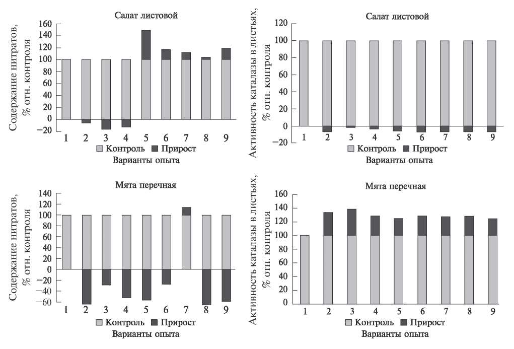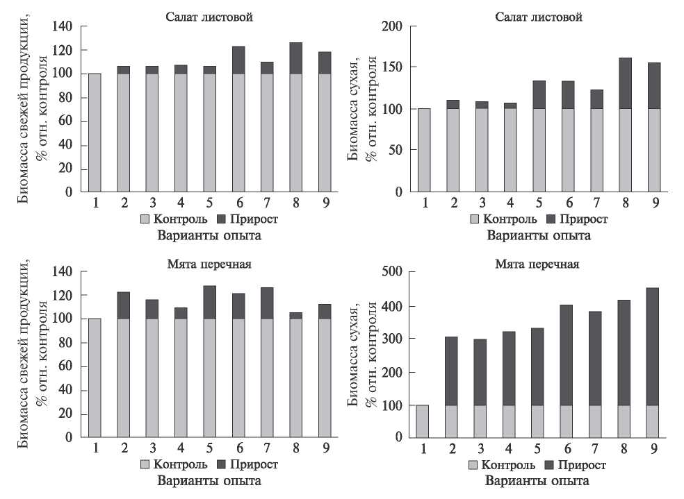 Максимальная прибавка сухой биомассы (55– 61%) относительно контроля получена в опыте с салатом в вариантах 8 и 6, мяты – на 315–353% относительно контроля в вариантах 8 и 9 (рис. 1).