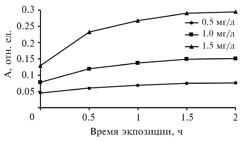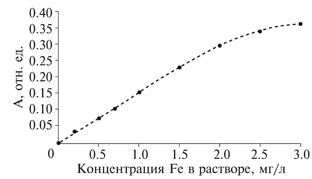Показано, в изученной системе устойчивая окраска развивалась в течение 1.5 ч. Дальнейшее увеличение времени экспозиции не приводило к росту оптической плотности растворов в исследованном диапазоне концентраций Fe.