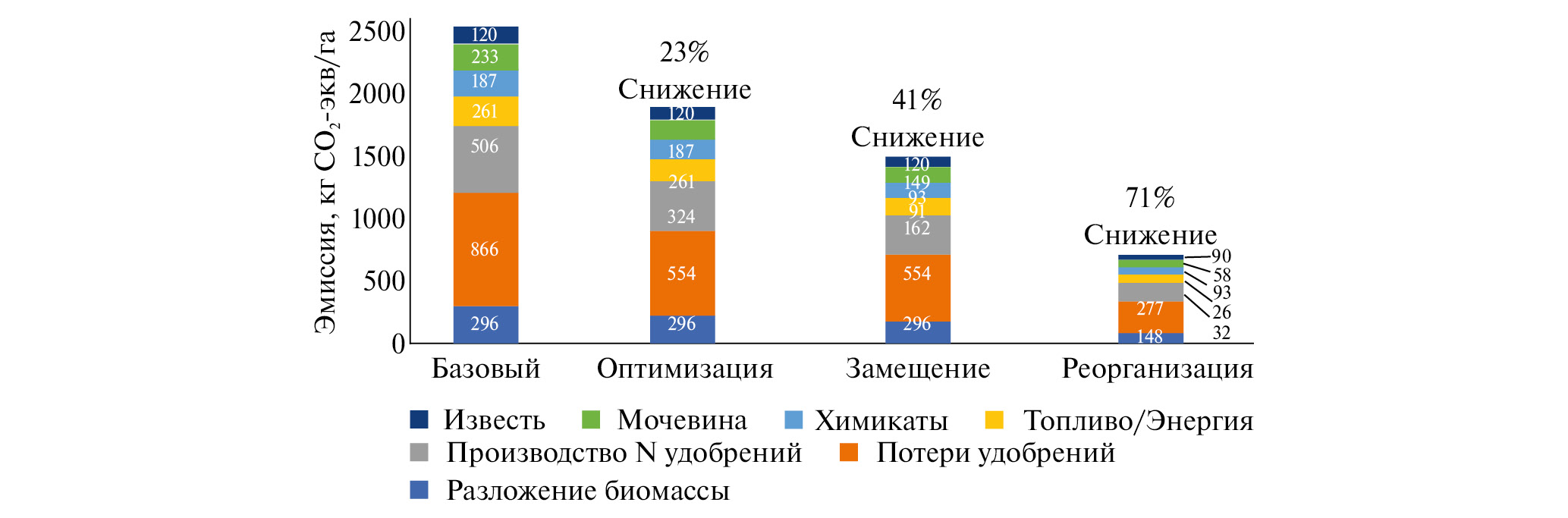 Рис. 2. Технические усовершенствования способствуют сильному снижению выбросов ПГ при производстве зерна. Числа – кг CO2-экв/га и разделены источником выбросов. Этапы (оптимизация, замещение и реорганизация) различаются по технической готовности стимулирующих инноваций. Реализация этапа оптимизации в значительной степени возможна с использованием существующих технологий, в то время как технологии этапа замещения могут быть доступны через 2–5 лет, технологии этапа реорганизации – через 5–15 лет.
