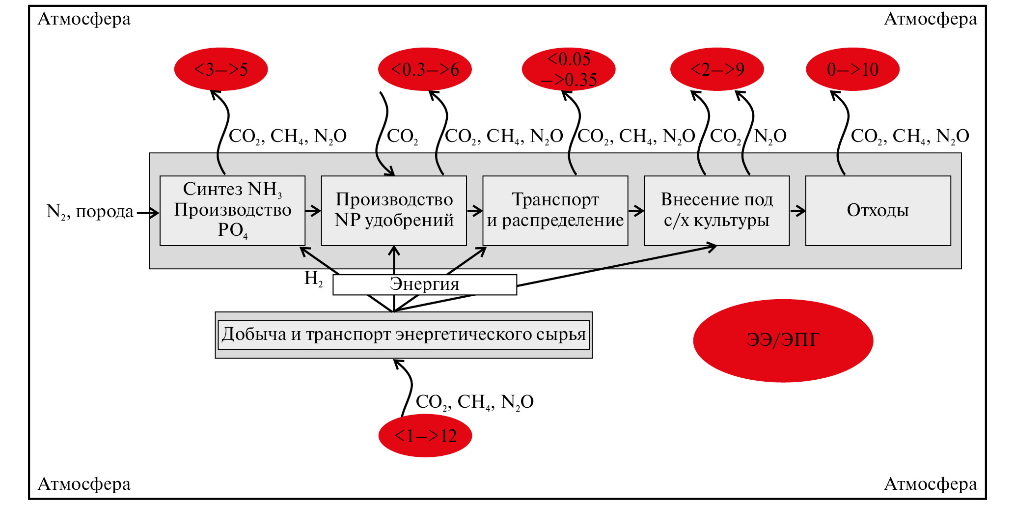 При этом основополагающей стратегией проведения исследований эмиссии углекислого газа как мере энергоэффективности на всех этапах для системы удобрений “производство – логистика – внесение – утилизация отходов” является оценка жизненного цикла как энергии, так и эмиссии ПГ (рис. 3).