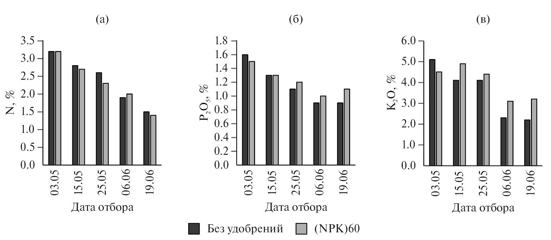 Рис. 1. Содержание азота (а), фосфора (б) и калия (в) в листьях левзеи сафлоровидной в различные периоды вегетации.