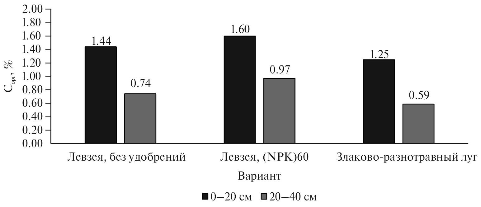 Длительное возделывание левзеи сафлоровидной способствовало обогащению дерново-подзолистой почвы органическим веществом. Содержание углерода выросло в слое 0–20 см относительно исходного уровня на 3.6% в варианте без удобрений и на 15.1% в варианте N60P60K60. Относительно целинного аналога (почвы под злаково-разнотравным лугом) содержание углерода в варианте без удобрений было больше на 15.2%, в варианте N60P60K60 – на 28.0% (рис. 2).