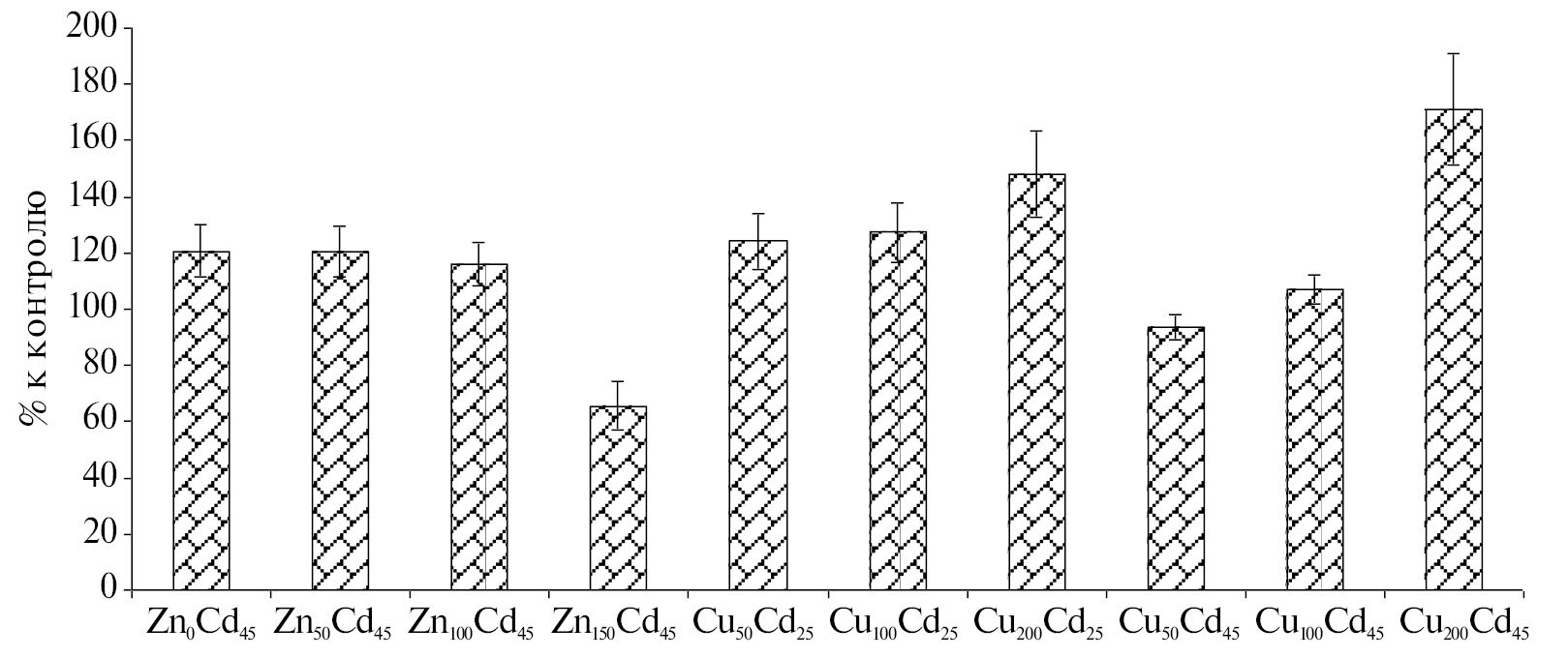В то же время при внесении в почву кадмия в концентрации 45 мг/кг медь иным образом взаимодействовала с этим поллютантом. При минимальной дозе меди (50 мг/кг) уровень токсического стресса снижался почти до контрольного уровня, но при дальнейшем возрастании дозы меди состояние растений ухудшалось. При внесении дозы 100 мг Cu/кг растения демонстрировали заметное угнетение, но все же могли еще продолжать рост и развитие, но при внесении 200 мг Cu/кг наблюдали полное угнетение растений.