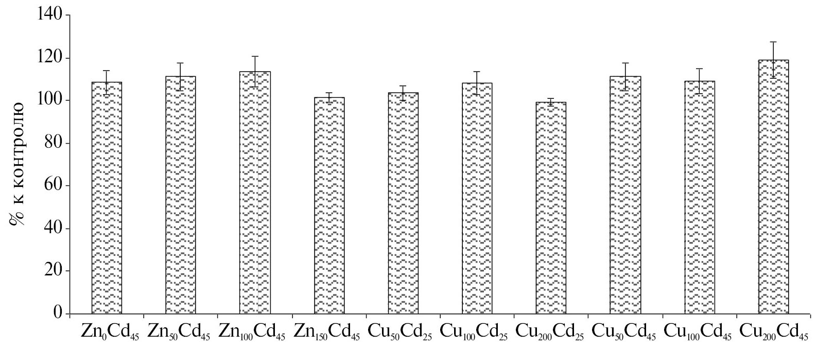 Полученные результаты отличались в зависимости от состава и концентрации внесенных в почву металлов. При внесении одного кадмия в дозе 45 мг/кг содержание антиоксидантов возрастало в среднем до 120% от контроля. Это говорит о том, что в тканях растений все же наблюдался повышенный выход свободных радикалов (хотя это и не приводило к значимому росту содержания МДА (рис. 3)), на что организм отвечал повышенным синтезом антиоксидантов. Добавление в почву цинка практически не меняло величины этого показателя, только при дозе цинка 150 мг/кг он снижался до 65% от контроля. Такие результаты свидетельствовали о том, что цинк, обладая низкой токсичностью, не вызывал развития окислительного стресса в диапазоне доз 50–150 мг/кг. Поэтому при внесении цинка не наблюдали ни угнетения роста и развития растений, ни повышенного образования МДА. Снижение количества антиоксидантов при максимальной дозе цинка можно увязать с развитием стимулирующего эффекта при действии данного ТМ в изученной концентрации (рис. 1, 2). Вероятно, окислительный стресс купировался какими-то иными механизмами, активно работающими в условиях возросшей интенсивности метаболизма.