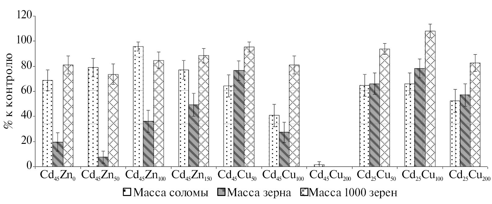 Иную тенденцию наблюдали при внесении в почву меди совместно с кадмием. В случае, если использовали дозу кадмия 25 мг/кг, то при минимальной концентрации меди (50 мг/кг) масса соломы оказалась близкой к той, что была получена в варианте с внесением только одного кадмия в дозе 45 мг/кг (65% от контроля). Похожая величина была отмечена для массы зерна (66%), а масса 1000 зерен находилась на близком к контролю уровню (93%). Увеличение дозы меди до 100 мг/кг практически не отражалось на массе соломы (66%), но позволяло в большей степени сократить токсическое воздействие кадмия на массу зерна (78% от контроля), при этом масса 1000 зерен демонстрировала явную стимуляцию развития растений – до 108% от контроля. При дальнейшем увеличении дозы меди (200 мг/кг) стимулирующий эффект на растения исчезал, и медь начинала оказывать токсическое воздействие. Масса соломы уменьшалась до 52% от контроля, масса зерна – до 57%, масса 1000 зерен – до 82%. Таким образом, величины изученных показателей оказывались меньше, чем при минимальной дозе меди, но в пределах ошибки. Следует отметить, что при максимальной дозе меди удалось получить большее количество зерна, чем при максимальной дозе цинка, хотя вегетативная масса была меньше. При действии меди на растения почти не развивалось пустых колосьев, хотя качество семян и ухудшалось (они становились мельче, приобретали деформации, медленнее созревали) по мере роста концентрации меди.