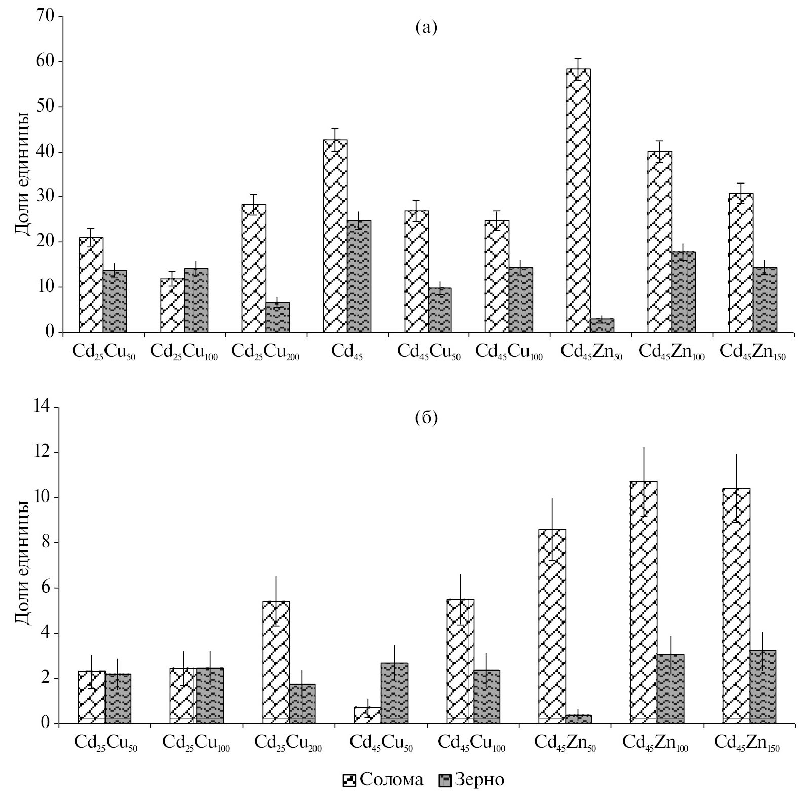 В целом медь накапливалась в надземной биомассе в количествах существенно меньших, чем кадмий (рис. 7а). В вариантах Cd25Cu50 и Cd25Cu100 содержание меди по сравнению с контролем возрастало незначительно как в соломе, так и в зерне (≈ в 2 раза). В варианте Cd25Cu200 накопление меди в соломе заметно увеличивалось (более чем в 5 раз от контроля), но в зерне даже уменьшалось (в 1.7 раза от контроля). Иной результат был получен в случаях, когда в почву вносили кадмий в дозе 45 мг/кг. В варианте Cd45Cu50 в соломе меди накапливалось даже меньше, чем при внесении дозы кадмия 25 мг/кг (в 0.7 раза больше контроля), а в зерне она содержалась примерно в таком же количестве, как и в варианте Cd25 (в 3 раза больше контроля). В варианте Cd45Cu100 накопление меди в соломе усиливалось (в 5 раз больше контроля), но в зерне значимо не менялось (более чем в 2 раза больше контроля).