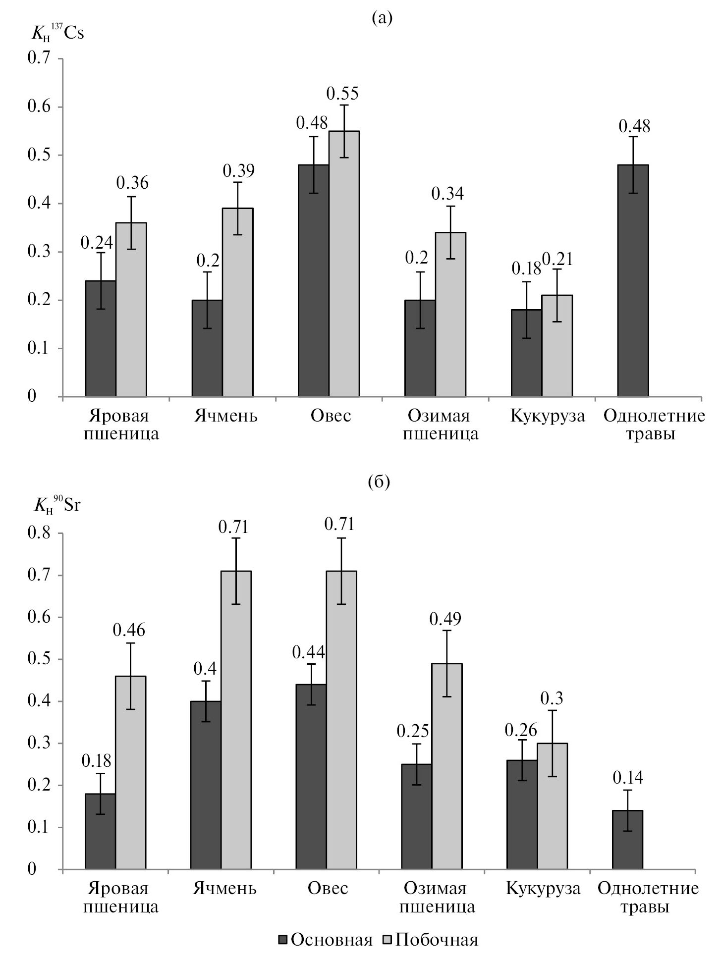 Накопление 90Sr основной и побочной продукцией большинства зерновых культур происходило в 1.35–2.09 и 1.27–1.75 раза более интенсивно соответственно, чем 137Cs, о чем свидетельствовали полученные показатели КН и, наоборот, для зеленой массы однолетних трав величина КН137Cs была в 3.43 раза больше, чем КН90Sr (рис. 1).