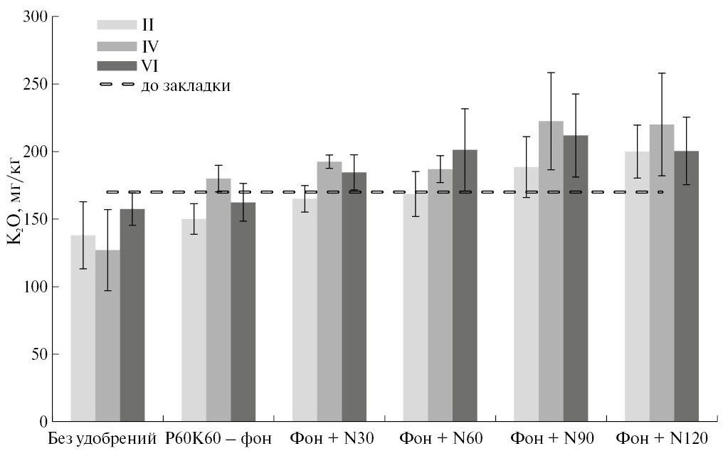 Содержание подвижных соединений калия в пахотном слое почвы (0–20 см) в данных вариантах в 4–6 ротациях было больше исходного уровня в 1.2–1.3 раза. Сравнение вариантов P60K60 и N60P60K60 показало, что поддержание содержания подвижных соединений калия на исходном уровне при применении полного минерального удобрения происходило в большей степени за счет влияния азотных удобрений на растворимость и доступность калийных соединений.