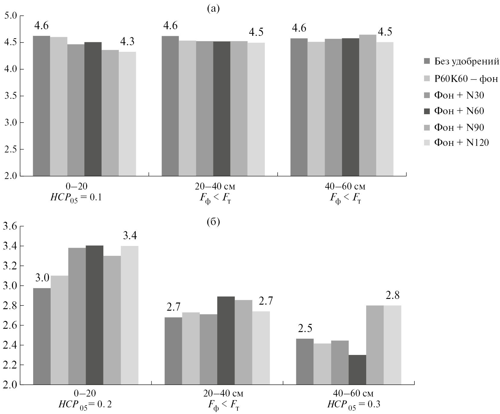Рис. 2. Изменение показателей рНKCl (ед.рН) (а) и гидролитической кислотности (мг-экв/100 г) (б) в слое 0–60 см почвы при длительном применении возрастающих доз азотных удобрений (6-я ротация).