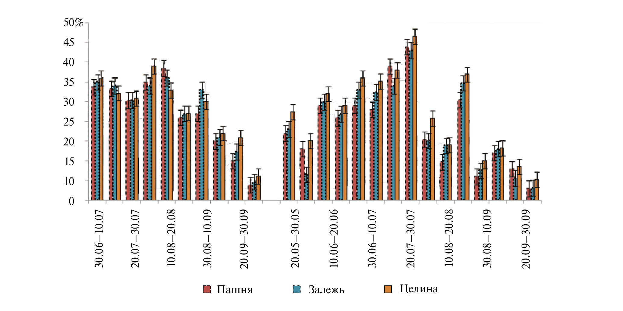 Максимальная протеазная активность отмечена в конце июля–начале августа. На пашне показатель был равен 35–39, на залежи – 34–36, на целине – 33–39%. В конце августа–начале сентября наблюдали уменьшение ПА на пашне до 27, на залежи – до 33, на целине – до 30%. Далее к концу вегетационного сезона протеазная ПА уменьшалась до 9–11% в ряду целина–залежь–пашня.