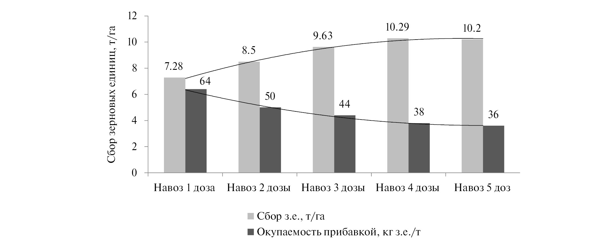 Дальнейший рост дозы навоза не приводил к достоверному увеличению продуктивности возделываемых культур. Окупаемость 1 т навоза прибавкой урожая с возрастанием дозы понижалась с 64 до 36 кг з. е. При этом на уровне нормативной (50 кг з. е. в расчете на 1 т навоза) она была при внесении навоза в двойной дозе (N240).