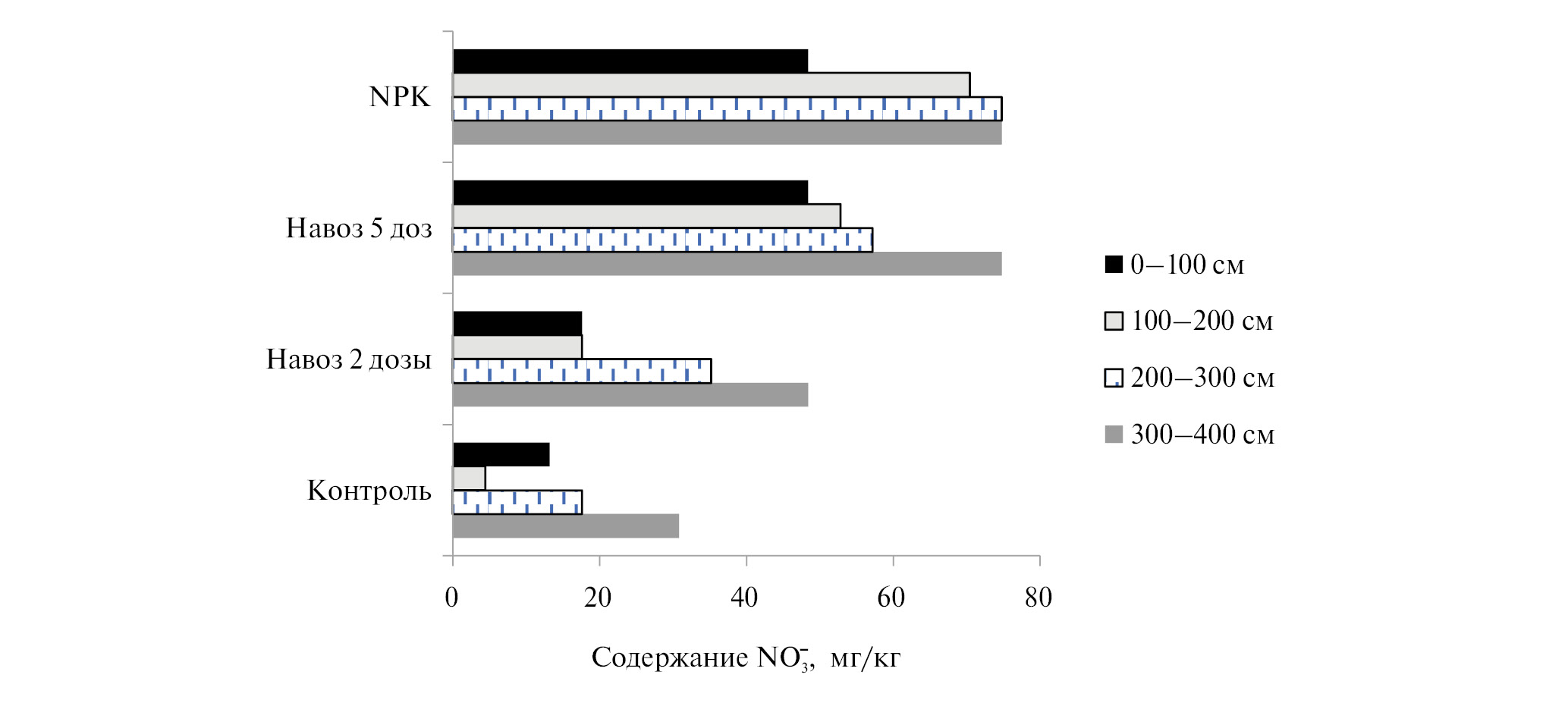 При использовании средств химизации важное значение в экологическом отношении придается миграции нитратов по почвенному профилю. В приведенном полевом опыте определяли содержание нитратов в почве в слоях 0–100, 100–200, 200–300 и 300–400 см. При этом была выявлена четкая зависимость изменения данного показателя от вида удобрений и количества внесенного азота (рис. 2).