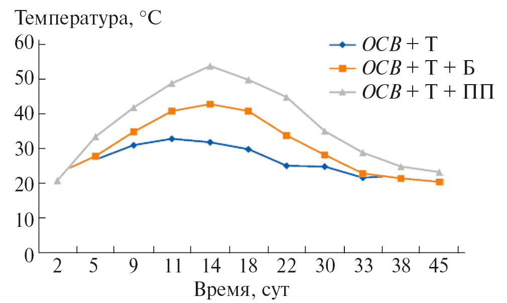 Эффективная высокотемпературная переработка в установках интенсивной аэрации отмечена лишь при использовании компостной смеси на основе ОСВ, торфа и птичьего помета. Переработка в интенсивном режиме при температурах, превышающих 50°С, с максимумом 55.8°С на протяжении 48 ч обеспечила надежное обеззараживание компостной смеси. Полученный биокомпост на основе ОСВ, торфа и птичьего помета соответствовал требованиям безопасности: содержание бактерий группы кишечной палочки, анаэробных клостридий не превышало 1000 микробных клеток/г, бактерии Salmonella typhi отсутствовали.