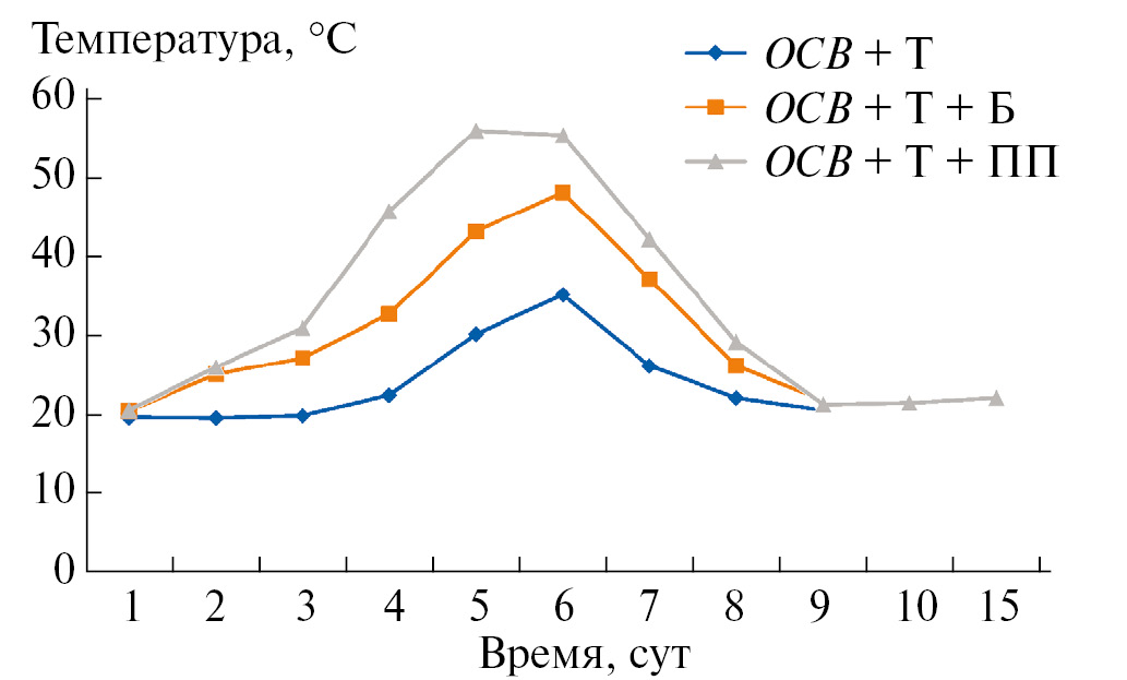 ОСВ + торф + птичий помет | 50 | 90.0 | 146 | 4.2 | +1.3 | 145 | – |