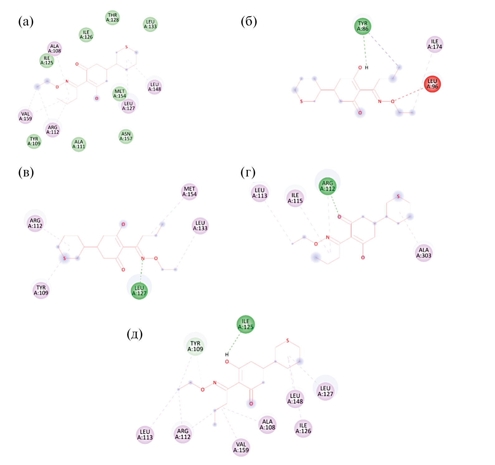 Рис. 1. Визуализация комплексов ACC с циклоксидимом для: (а) – D. sanguinalis, (б) – E. crus-galli, (в) – G. max, (г) – P. annua, (д) – S. viridis.