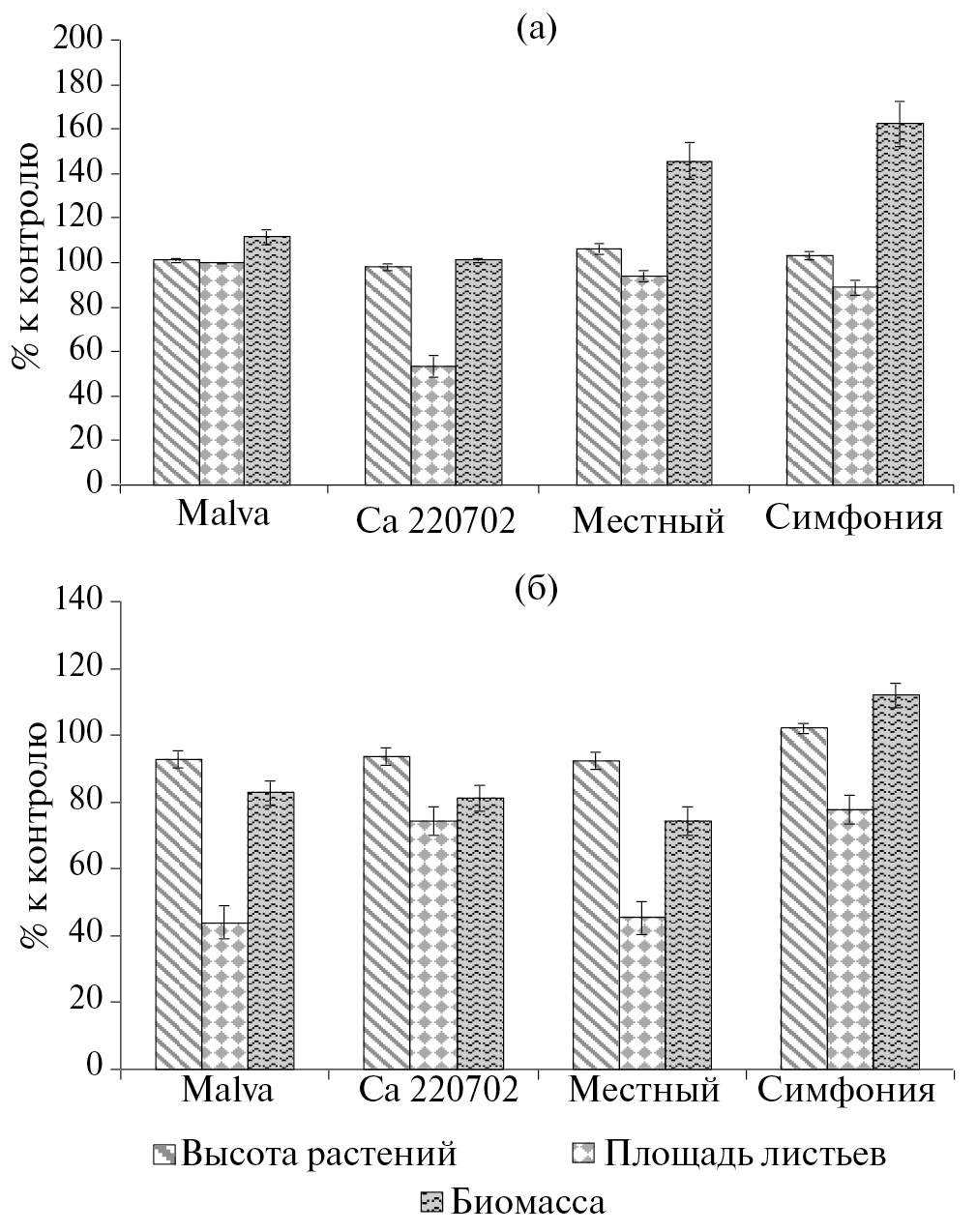 В то же время при концентрации кадмия 50 мг/кг наблюдали заметное угнетение развития как чувствительных, так и устойчивых сортов. Однако это утверждение справедливо не для всех сортов и не для всех показателей (рис. 2б). При этом внутривидовые особенности ответа растений на токсический стресс четко отследить не удалось. Например, высота растений всех 4-х сортов менялась на уровне, близком к контрольному, или оказывалась, несущественно меньше такового (до 92% у устойчивого сорта Местный). Сорт Симфония, правда, немного опережал остальные по этому показателю, но на незначительную величину (102% от контроля). Внутривидовые показатели площади листьев различались существенно, однако их не удалось связать с выявленной ранее устойчивостью к кадмию. Например, значимое угнетение демонстрировали как устойчивый сорт Местный (45% от контроля), так и чувствительный Malva (44%). В то же время у устойчивого сорта Симфония и чувствительного Са 220702 также наблюдали угнетение этого показателяя (78 и 77% соответственно), но гораздо меньшее, чем у 2-х других сортов. Что касается биомассы, то она сокращалась при действии кадмия у всех сортов, кроме сорта Симфония, у которой, напротив, даже отмечена стимуляция (112% от контроля).