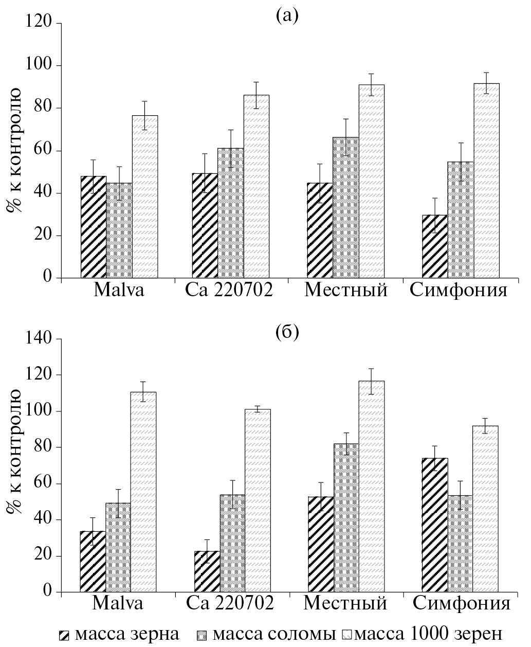 Более информативным оказался вариант с внесением кадмия 50 мг/кг (рис. 6б). В этом случае угнетение развития чувствительных сортов было выражено заметно отчетливее. Устойчивые сорта тоже демонстрировали уменьшение рассмотренных показателей, но в меньшей степени. Наиболее отчетливые различия отмечены для массы зерна. Для чувствительных сортов она составила 22 и 33% от контроля, в то время как для устойчивых – 52 и 73%, при этом наиболее чувствительным оказался сорт Са 220702, а самым устойчивым – Симфония (разница между ними была более чем в 3 раза). По массе соломы различия между группами контрастных сортов тоже отмечали, но менее заметные. Величина показателя у обоих чувствительных сортов менялась в пределах ошибки (49 и 54%), величина параметра у устойчивого сорта Симфония также укладывалась в этот диапазон (53.6%). И только сорт Местный существенно превосходил остальные (82%). Масса 1000 зерен оказалась наименее информативным показателем, и изменения его величины были несущественными. Сорт Местный имел наибольшую величину этого показателя (117%), однако она значимо не отличалась от таковой у чувствительного сорта Malva (111%).