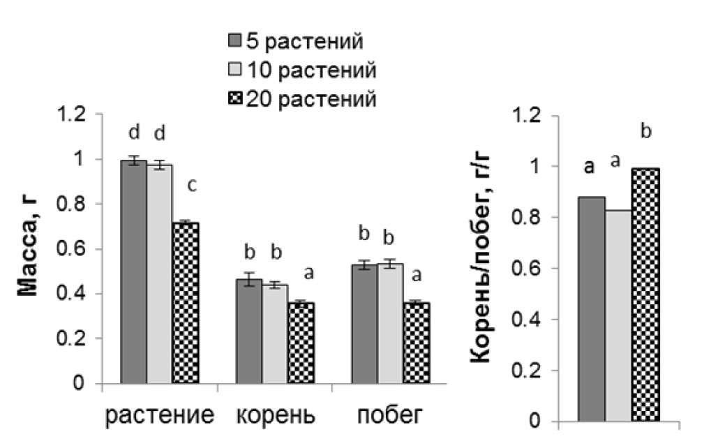 При выращивании проростков пшеницы в вегетационном сосуде через 13 сут максимально плотная посадка (20 растений/сосуд) приводила к заметному снижению массы одного растения по сравнению с растущими по 5 шт./сосуд (рис. 1).