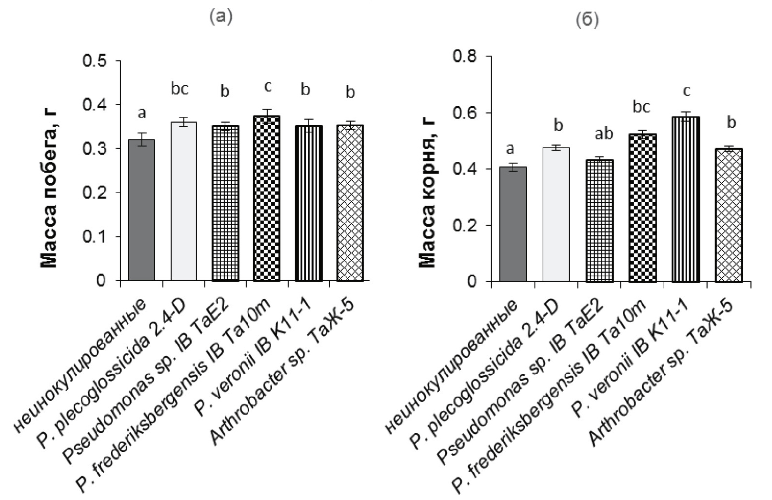 Максимальная масса была отмечена как у целого растения, так и у корня при обработке P. frederiksbergensis IB Ta10m и P. veronii IB K11-1. Соответственно, все изученные деструкторы АБК позитивно влияли на рост растений пшеницы при выбранной высокой плотности посадки.