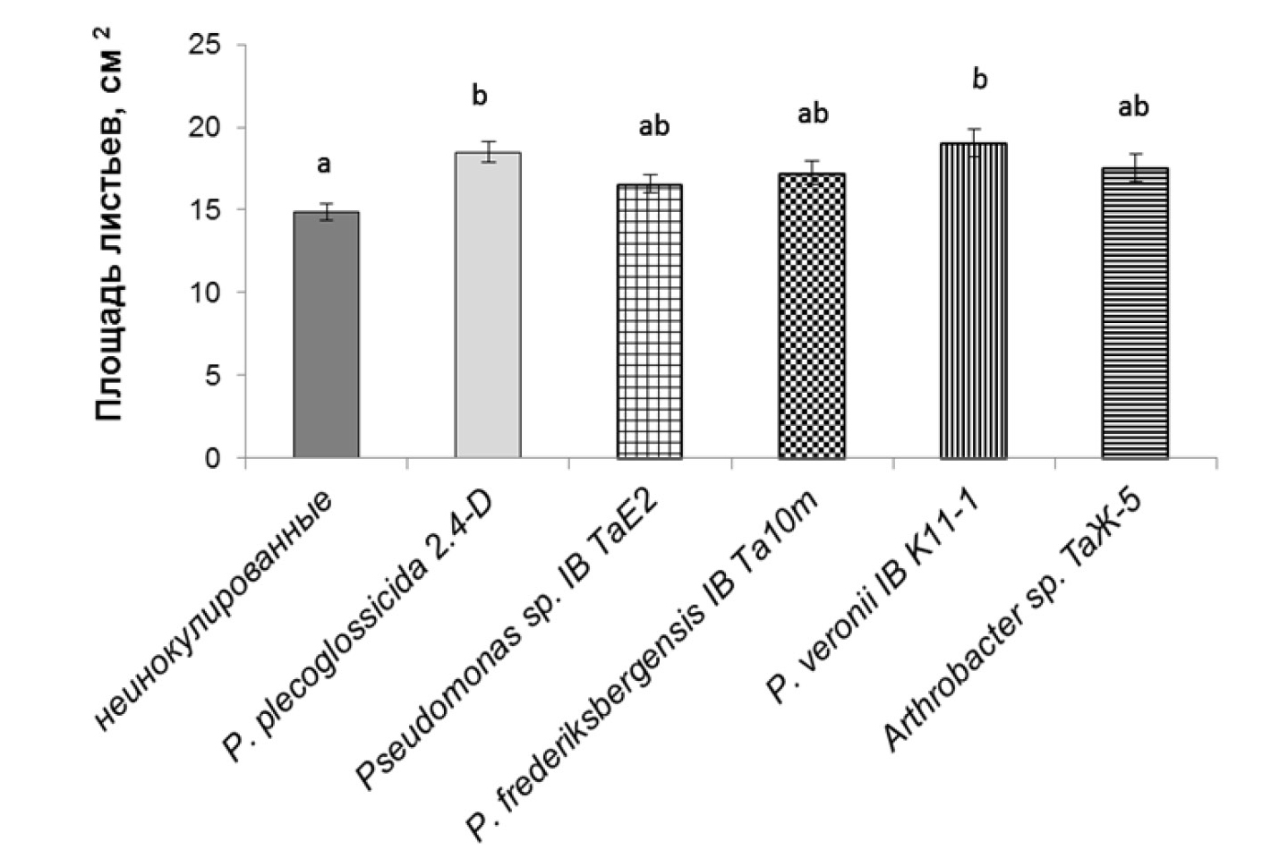 Штаммы использованных для обработки микроорганизмов в основном из рода Pseudomonas (P. plecoglossicida 2.4-D (KY593189.1), описанные ранее [16, 18], Pseudomonas sp. IB TaЕ2 (PP316703), P. frederiksbergensis IB Ta10m (PP316701), P. veronii IB K11-1 (PP237770)) и Arthrobacter sp. TaЖ-5 находятся в коллекции Уфимского института биологии УФИЦ РАН [17].