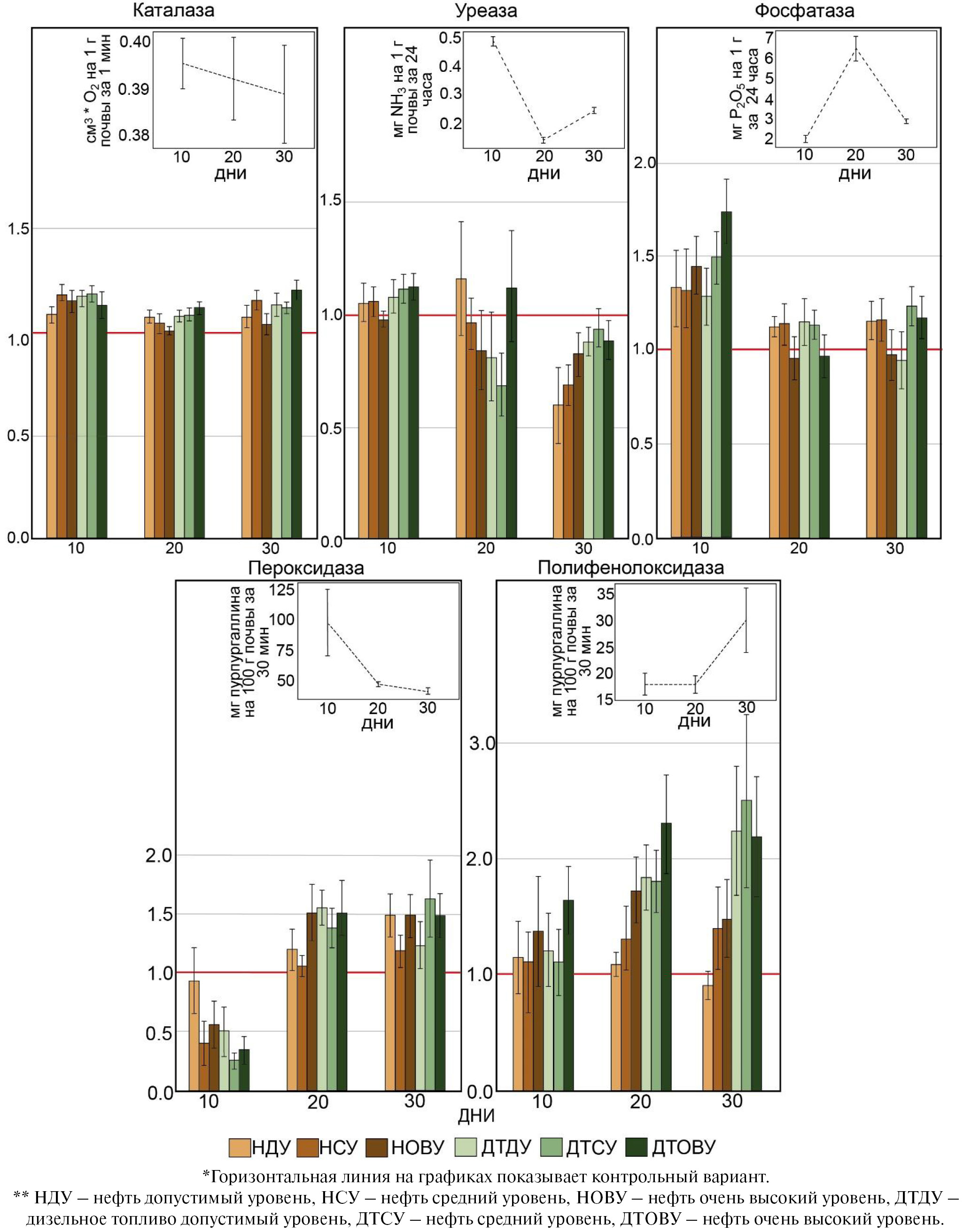 Значительного отклика ферментов каталазы и фосфатазы при загрязнении нефтью и дизельным топливом не обнаружено. По чувствительности к загрязнению нефтью и дизельным топливом ферменты располагались в следующем ряду: пероксидаза = полифенолоксидаза > уреаза > каталаза = фосфатаза.