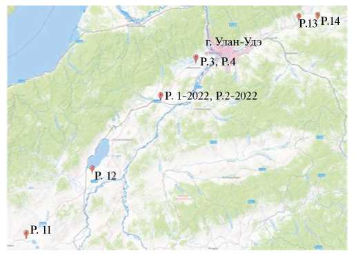 Исследование проводили в 2010–2012, 2022 гг. в сухостепной зоне на территории Заиграевского, Селенгинского, Иволгинского и Джидинского административных районов Республики Бурятии (рис. 1).