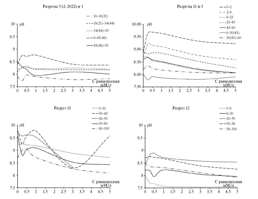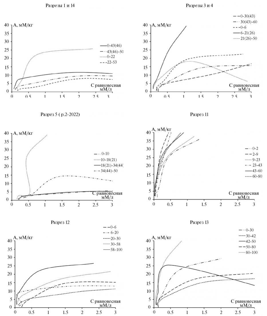 Следует отметить, что в диапазоне исследованных концентраций рабочих растворов поглощение калия солончаком глеевым (р. 11), почвообразующей породой солончака типичного (р. 13, 80–100 см), гумусовым горизонтом аллювиальной светлогумусовой (р. 4, 6–21(26) см) шло интенсивно. В этом случае кривые изотермы были близки к прямой и расположены под большим углом наклона к оси абсцисс (рис. 2).