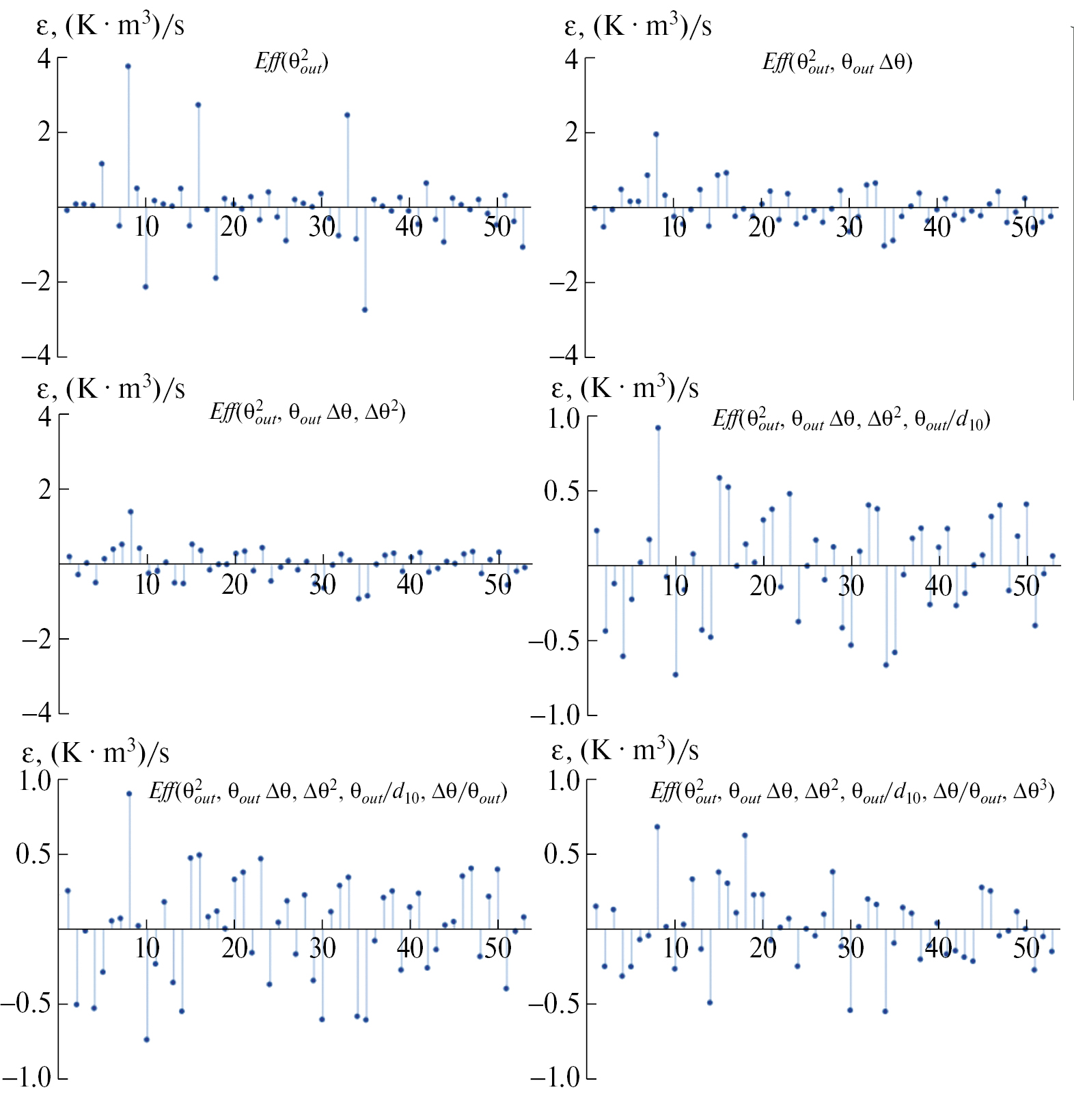 Значение эффективности испарения распыла для каждой конфигурации записывалось в виде массива, имеющего вид {d10, θout, Δθ, Eff}. Затем для этого массива была выполнена линейная регрессия с помощью Wolfram Engine [27]. Три независимые переменные (d10, θout, and Δθ) рассматривались в различных комбинациях (отношениях): полином (d102, d103, d104 и т. д.), произведение (d10 · θout, d10 · Δθ и т. д.), отношение (d10 / θout, d10 / Δθ и т. д.) и степень (d10θout, d10Δθ и т. д.). Общее количество рассмотренных комбинаций – 31.