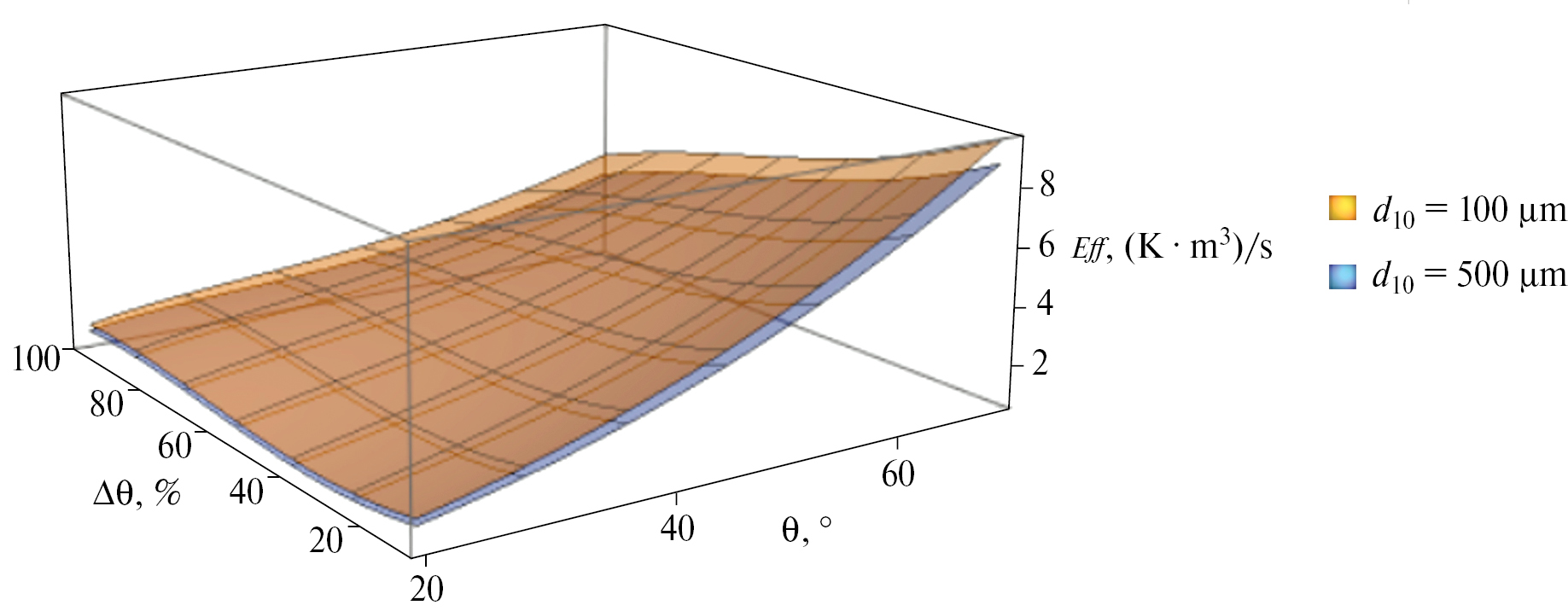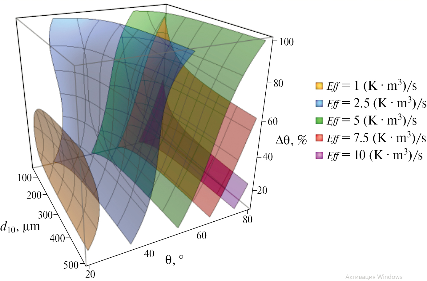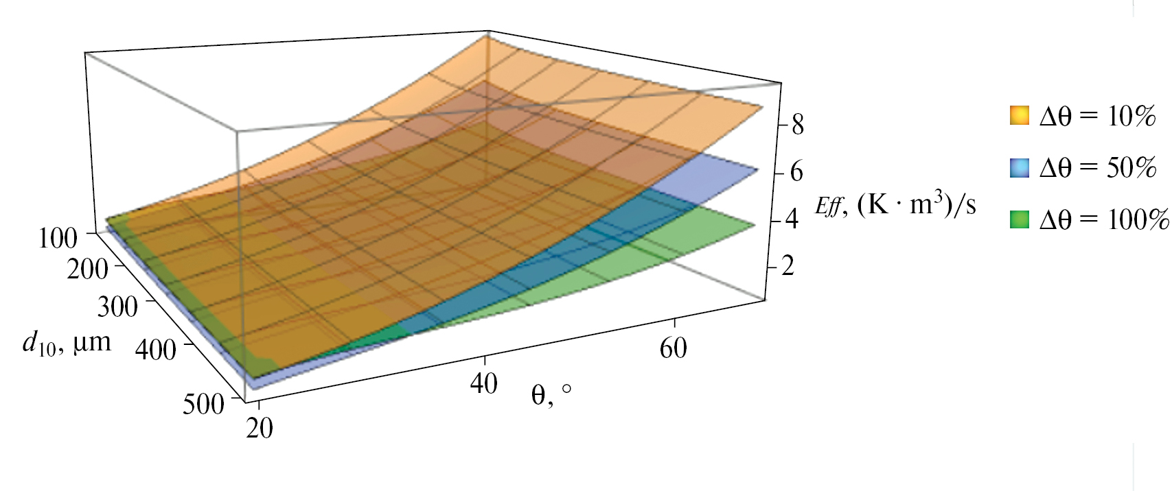 Эффективность испарения распыла может быть представлена в виде вектора, направленного в сторону широких полых конусов мелкодисперсных распылов (дальний нижний угол диаграммы на рис. 6). Для визуализации области с эффективностью Eff > 10 (K·м3)/с исходные диапазоны конструктивных параметров форсунки были расширены на рис. 6. Пространственное распределение изоповерхностей показало возможность линейного роста эффективности испарения при увеличении только угла раскрытия конуса. Однако такая стратегия ограничивает предельную эффективность при использовании полных конусов распыла. Таким образом, наиболее эффективная стратегия заключается в одновременном увеличении угла раскрытия конуса и сокращении его полноты.