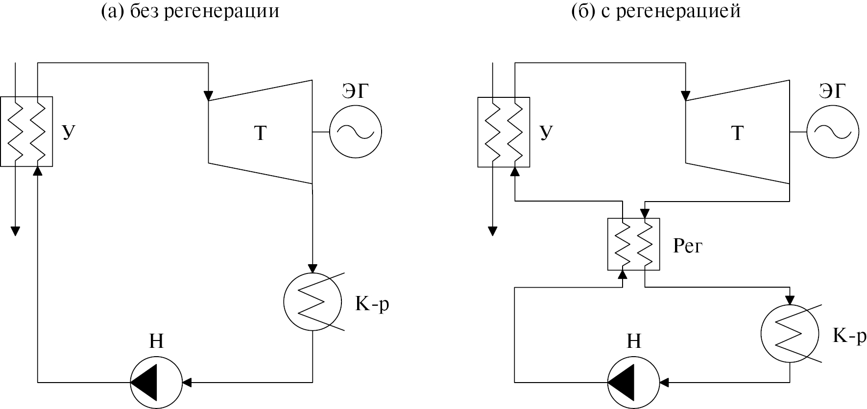 Рис. 2. Тепловые схемы рассматриваемых утилизационных установок: У – утилизатор; Т – турбина; К-р – конденсатор; Н – насос; Рег – регенератор