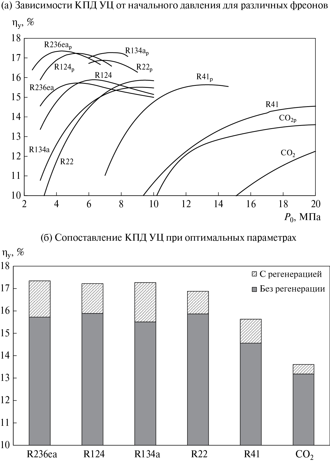 Для утилизации теплоты уходящих газов с повышенной температурой в работе были рассмотрены ОЦР на различных видах рабочих тел. На рис. 4 приведено сопоставление их энергетической эффективности. При надстройке утилизационного цикла к ПГУ с температурой уходящих газов 183°C (с дальнейшим их охлаждением до 80°C в цикле) наиболее эффективным является ОЦР с фреоновым рабочим телом R236ea. КПД нетто ОЦР достигает 15.72% в базовом варианте и доходит до 17.35% при использовании схемы с регенератором.